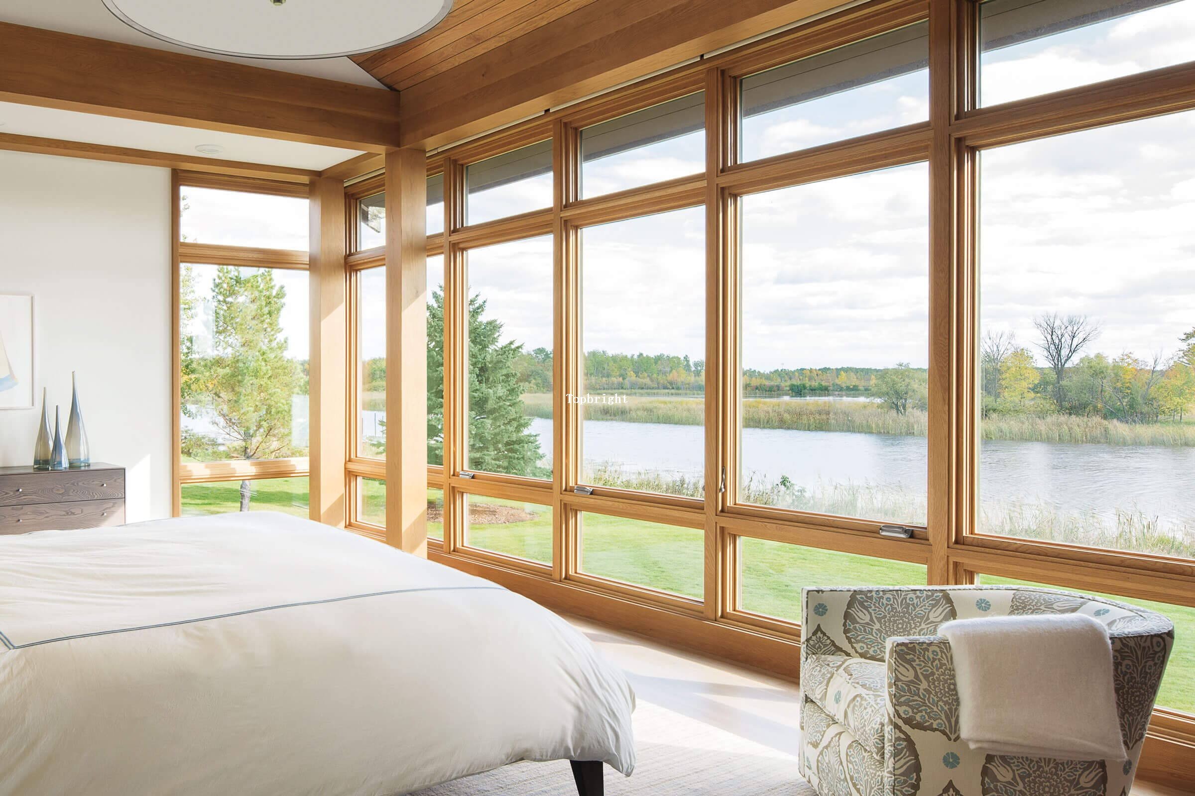 Available with casement windows in the following styles: 30° bay, 45° bay, 90° bay and 10° bow; Available with double-hung windows in the following styles: 30° bay, 45° bay; Wood protected by aluminum exterior; Custom colors, interior woods and stains